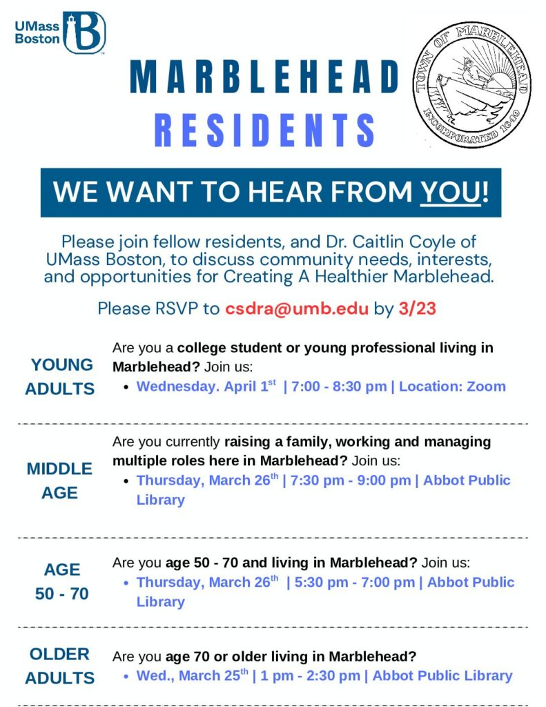 Good morning, Marblehead Residents, As you probably know that Board of Health has developed an initiative for Creating A Healthier Marblehead (Acronym CAHM). The first major component of CAHM was a survey to determine the perception of wellness in the town. We are grateful to the over 2550 residents who completed that survey. The second…