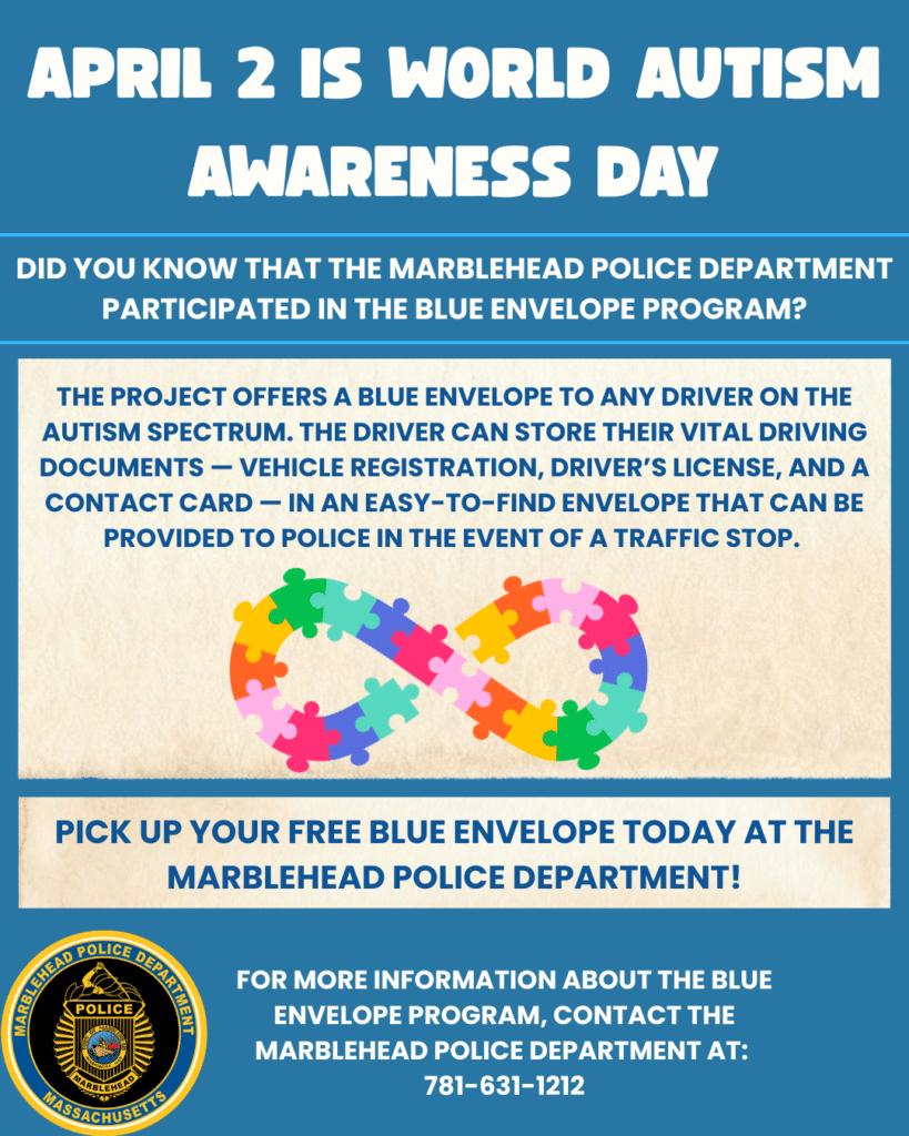 April 2 is World Autism Awareness Day, and the Marblehead Police Department is proud to support our community through initiatives like the Blue Envelope Program. The Blue Envelope Project was created via a partnership among the Massachusetts Chiefs of Police Association, Massachusetts State Police, Advocates for Autism of Massachusetts, and The Arc of Massachusetts, along…