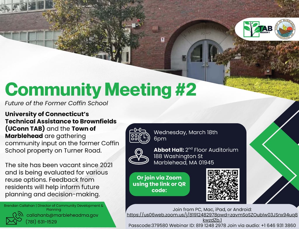 The event will be held on March 18th from 6:00 to 8:00 PM in the Abbot Hall Auditorium, on the 2nd Floor and virtually via Zoom. Additional information about the event can be found here: https://marbleheadma.gov/event/coffin-school-community-meeting-2/