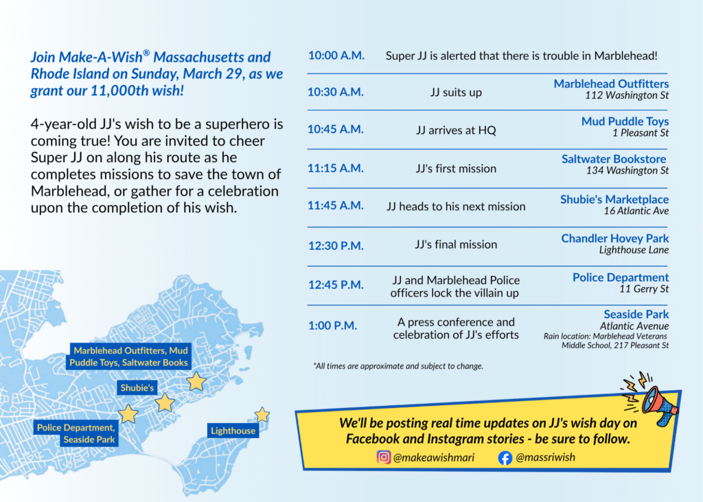 JJ’s wish to be a superhero marks the 11,000 th wish fulfilled by Make-A-Wish® Massachusetts and Rhode Island, which grants life-changing wishes for children with critical illnesses.